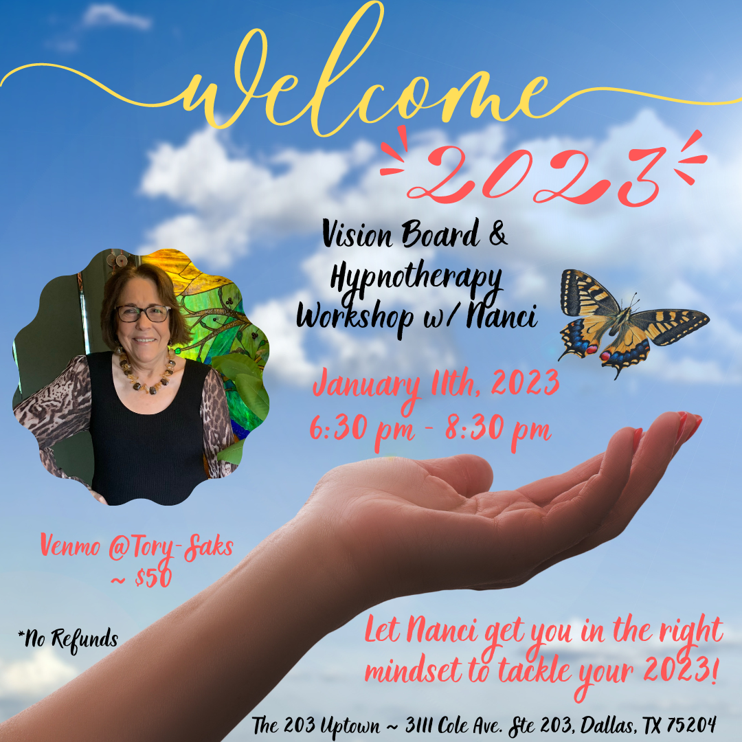 Finding your Power with Hypnosis & your Personal Vision Board with Nanci on January 11th starting at 6:30 pm at The 203 Uptown. Come learn practical tools for manifesting your dreams and goals and have a blast doing it! This workshop includes making your personal vision board for 2023 (all supplies included) and a powerful hypnosis session with Nanci DuPlant, a certified clinical Hypnotherapist (since 1977). She will help you set your true intentions for your BEST LIFE. Reserve your spot now by Venmoing @Tory-Saks $50 and mentioning this workshop. Spaces are already filling up! Learn more about Nanci by visiting www.thehypnotherapyclinic.net.